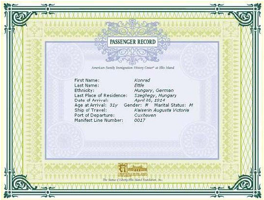 Konrad Exle, ungarisch-deutsche Nationalität, letzter Wohnort Szeghegy-Hungary, 31 Jahre alt, männlich, verheiratet, kommt am 05.April 1914 auf dem Schiff "Kaiserin Auguste Victoria" mit Abfahrt von Cuxhaven in Ellis Island an. Sein Reiseziel war Chicago, Illinois. Er bezahlte die Reise selbst und führte 16 Dollar Reisegeld mit sich. Er reiste zu einem Bekannten, Josef Szahállos nach Chicago Ill.